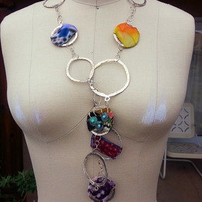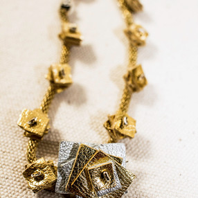 Based on elements from Taos Pueblo culture, such as glimmering mica and adobe Pueblo architecture, Patricia's jewelry uses textiles and leather leftover from other collections so nothing goes to waste. Patricia studied jewelry design at the Institute of American Indian Arts and the Chicago Art Institute. She has developed these collections primarily to be able to outsource cottage industry work to young Pueblo men and women.